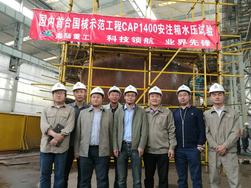 2017年4月25日16時(shí)20分,CAP1400示范工程1號(hào)機(jī)組首臺(tái)安注箱在海陸重工核電車間水壓試驗(yàn)順利完成!